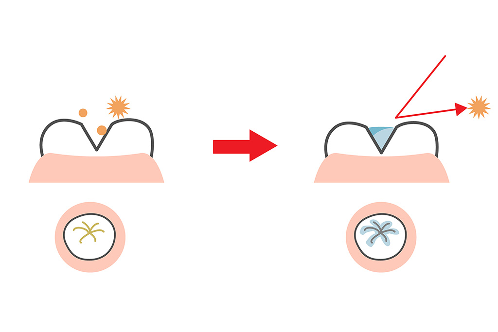 シーラントは奥歯の溝を埋めて、歯ブラシが届きにくい部分に食べカスが溜まらないようにカバーする予防方法です。